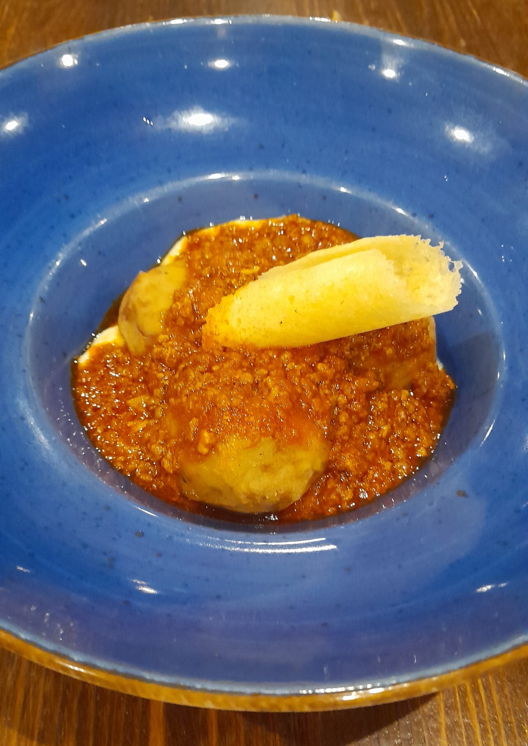 Canederli serviti con fonduta di formaggi e ragù di manzo cotto a bassa temperatura